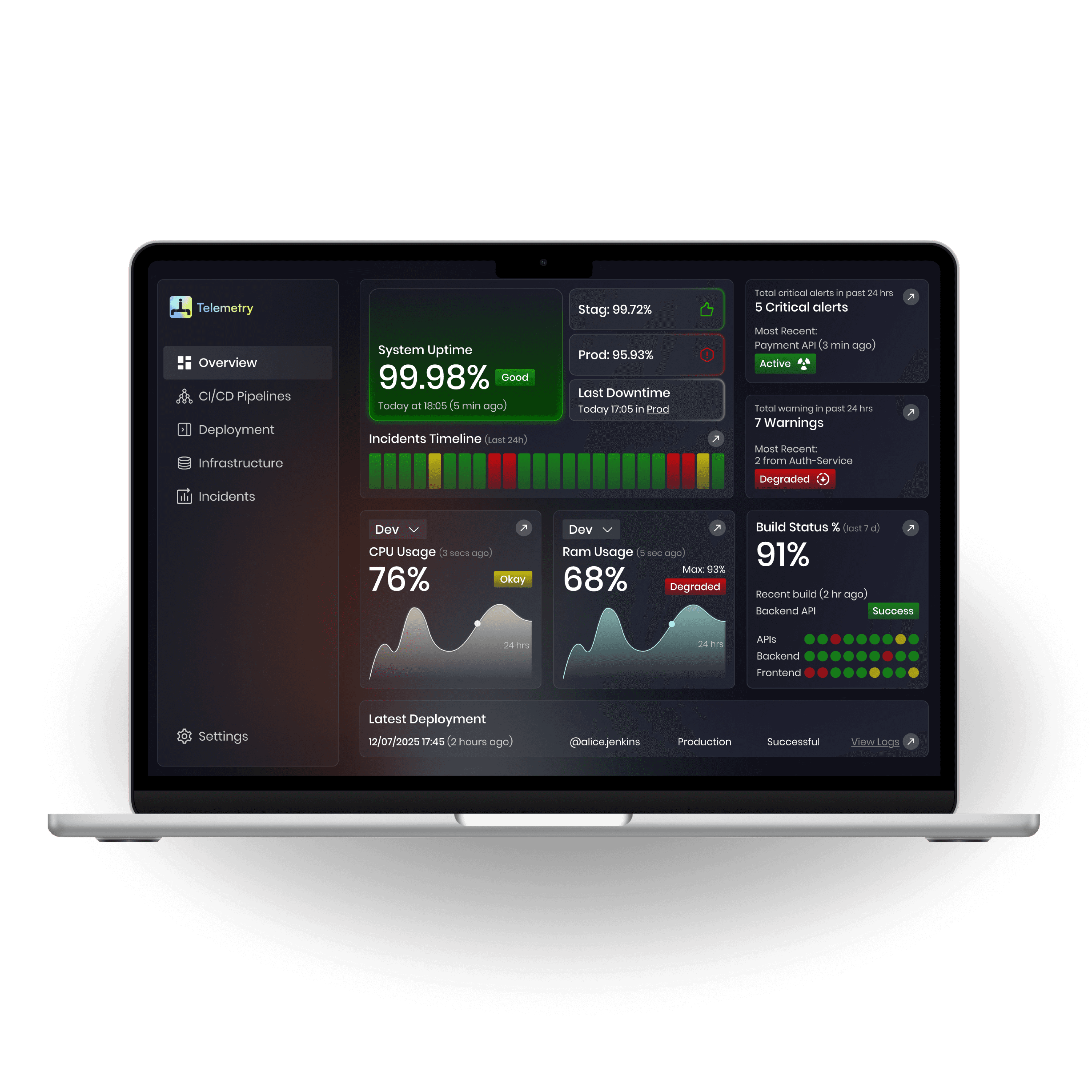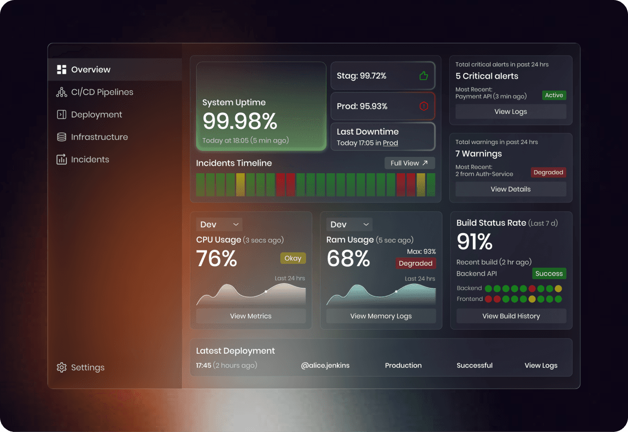 DevOps dashboard that unifies real-time CI/CD, deployment, and infrastructure data into a drill-down interface to help developers and SREs monitor, debug, and optimize performance.